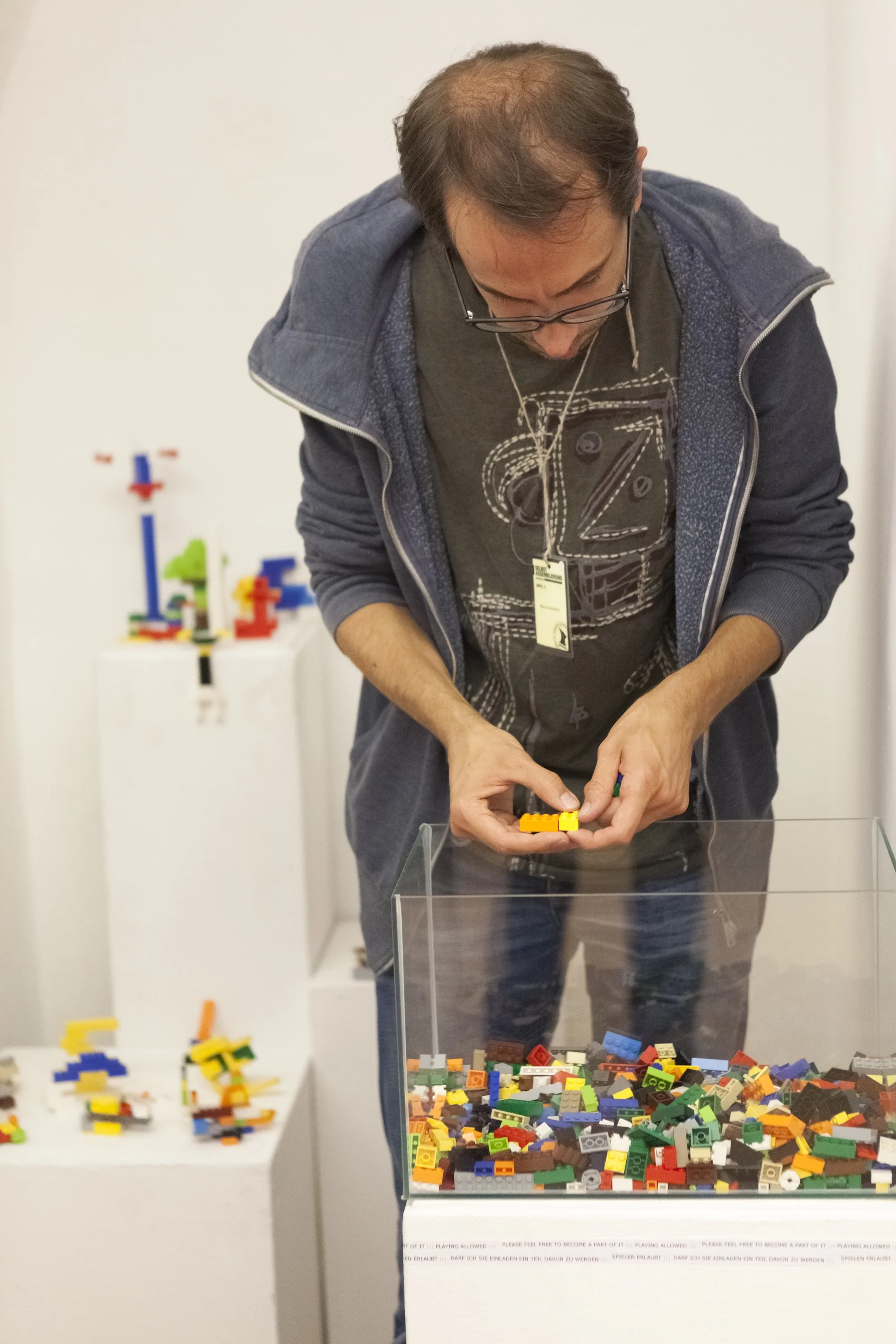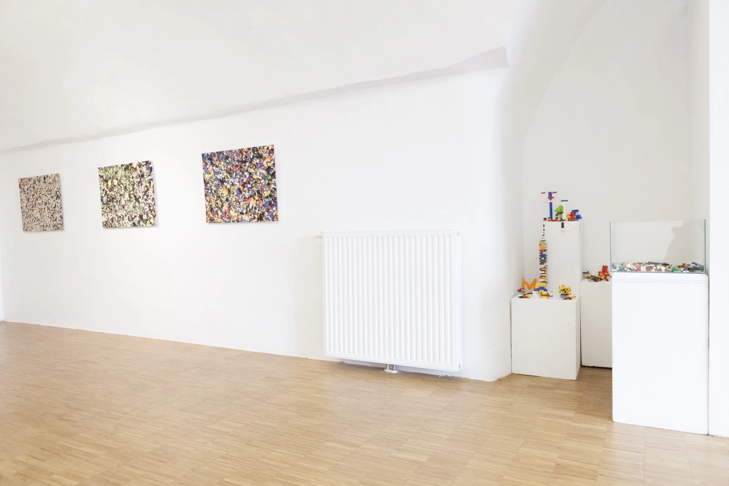 Mit den sozialen Prozessen der Selbstassemblierung setzt sich Ela Grieshaber in ihrer Arbeit auseinander und stellt diese bildlich dar, metaphorisch auf das Prinzip der Legosteine umgesetzt. Steine – die wahllos im Chaos nebeneinander liegen, aber potenziell miteinander verbunden werden können. Eine gewisse Anzahl an Steinen stehen zur individuellen Gestaltung zur Verfügung. Die Gestaltung ist nun die Wahl die gegeben ist. Natürlich sind nie genügend rote oder blau Steine da und natürlich hat der Nachbar die schöneren Steine, „aber sobald eine gewisse Menge an Legosteinen vorhanden ist kann man fast alles bauen. Die Gebrauchsanleitung ist dabei nur als eine Hilfestellung zu verstehen.“ Die Besucher sind eingeladen sich selber in den gestalterischen Prozess einzubringen und mit den Steinen aus der Kiste ihre eigenen Skulpturen zu bilden und somit die ausgestellte Arbeit ein wenig zu verändern.
